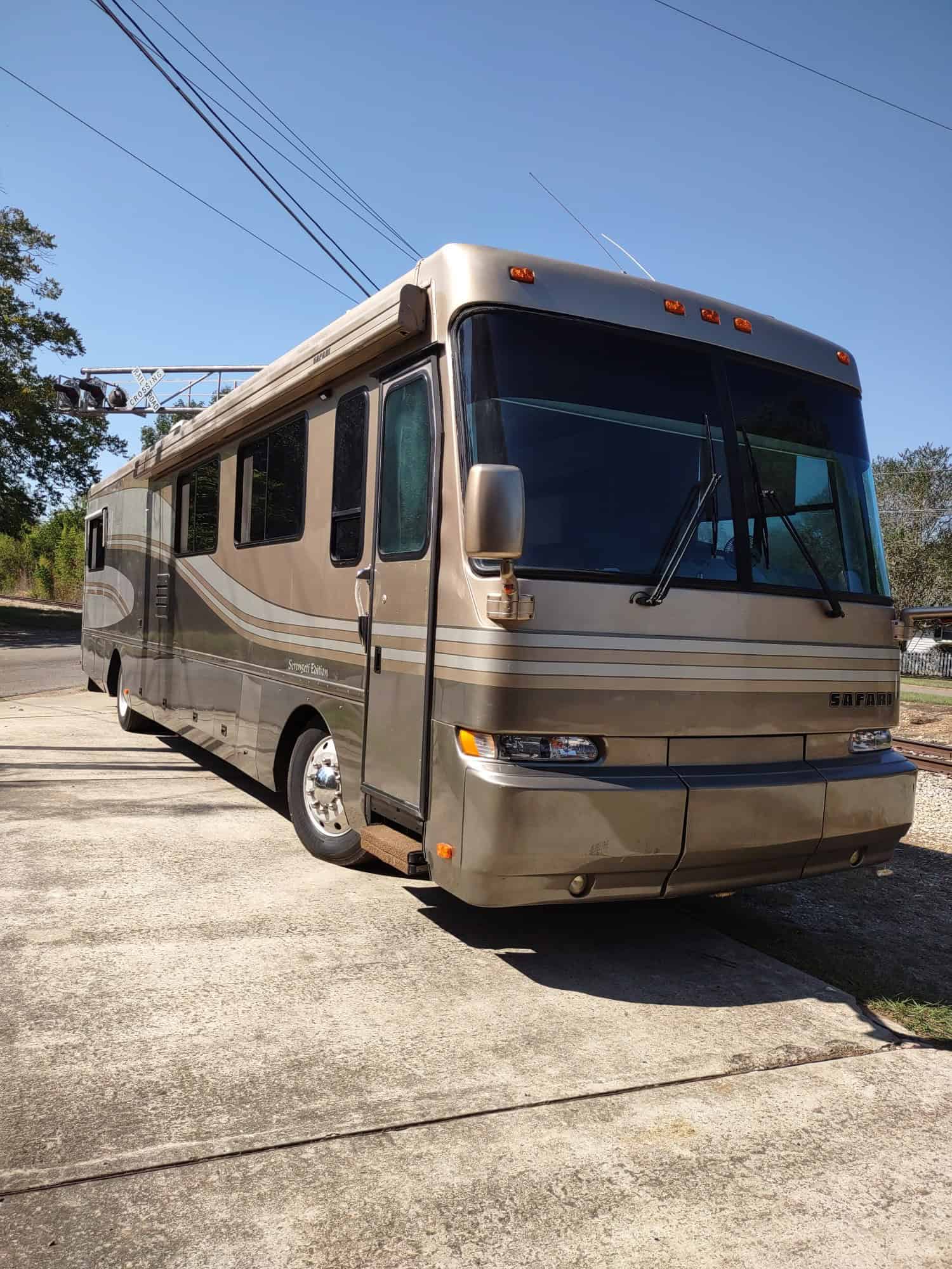 Our beach house near Mexico Beach FL. was badly damaged during hurricane Michael in 2018. In early 2000’s, we saw the need to put a pole barn and an RV on our double lot to monitor the construction progress. I was told it was going to and take several years to complete due to shortages of construction workers, and it did! I have since sold the house and pole barn. The RV is now in my driveway waiting for a new owner. My wife and I are not RV’ers. we have over $45,000 invested with the RV price included. I renovated for our sake, not an investment. I originally bought it from a diesel mechanic who owned his own 10 bay shop, so I knew the Magnum chassis, 350 Cat engine, brakes, 7500W diesel generator, Allison transmission and electrical was well maintained and roadworthy. I renovated the inside out with lots of custom touches. All tires and batteries were replaced within the last 2 years! As pictured, all new LVP flooring plus (original tile), all cabinets professionally primed and painted a pleasant acrylic latex paint. New wall hugging power recliners. 50″ flat screen with televator that disappears into the cabinet. Replaced fridge with same model. Microwave is also a convection oven. We reconfigured the bedroom to accommodate a KING sized bed. The headboard is custom printed and padded to enjoy morning coffee and the news. Power cantilever awning!
