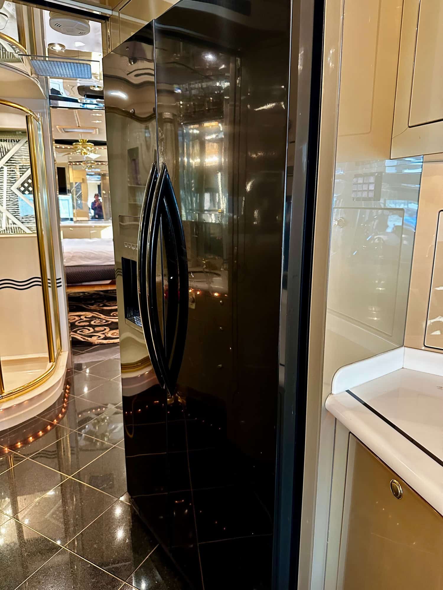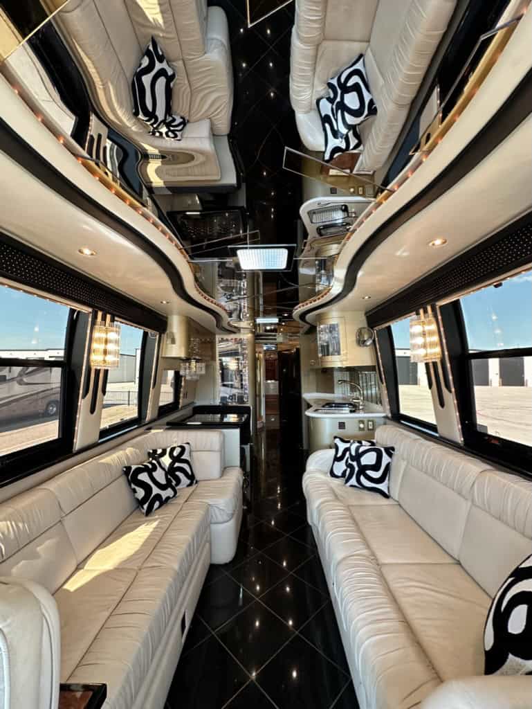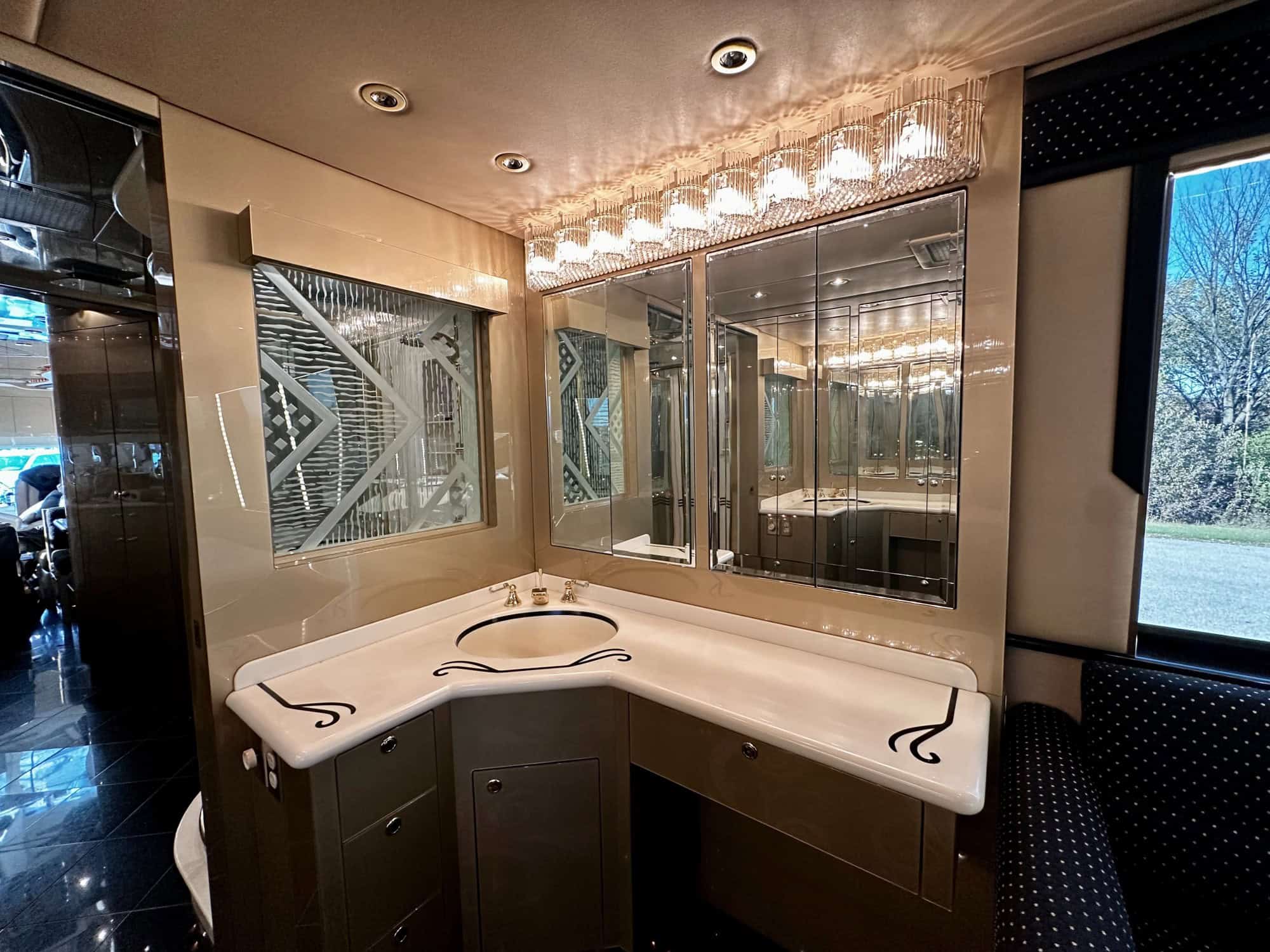 Step inside to a stunning salon that feels more like a high-end Las Vegas penthouse than a motorcoach. The space features: Dual opposing cream leather sofas with striking black-and-white designer pillows, Gloss-black tile floors that mirror soft ambient lighting, A mirrored ceiling and custom accent lighting that create a sense of height and glamour, Crystal wall sconces and brass fixtures that deliver timeless Vantare elegance, The gourmet galley features high-gloss cabinetry, solid-surface countertops with elegant black inlays, a deep sink with gold fixtures, and a residential-style refrigerator. Perfect for entertaining or enjoying a quiet dinner on the road, The bathroom suite is beautifully appointed with a full corner vanity, crystal lighting, and a separate curved-glass shower trimmed in gold every inch reflecting Featherlites legendary attention to detail,