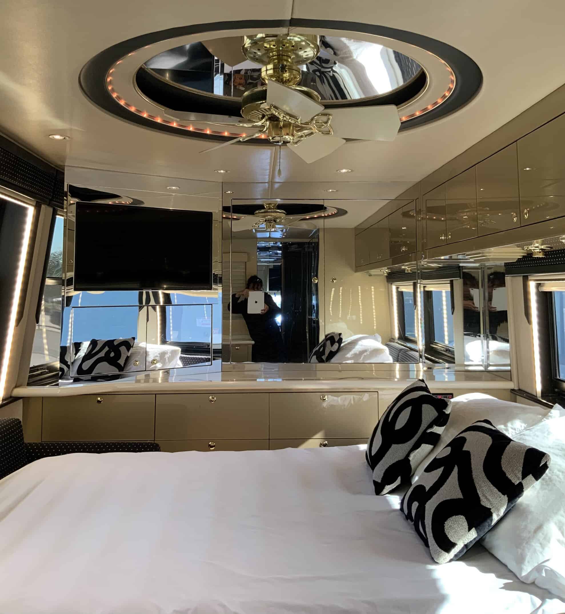 The private rear stateroom (not pictured) offers tranquil comfort with custom lighting, mirrored accents, and ample storage the ideal retreat after a long days drive.