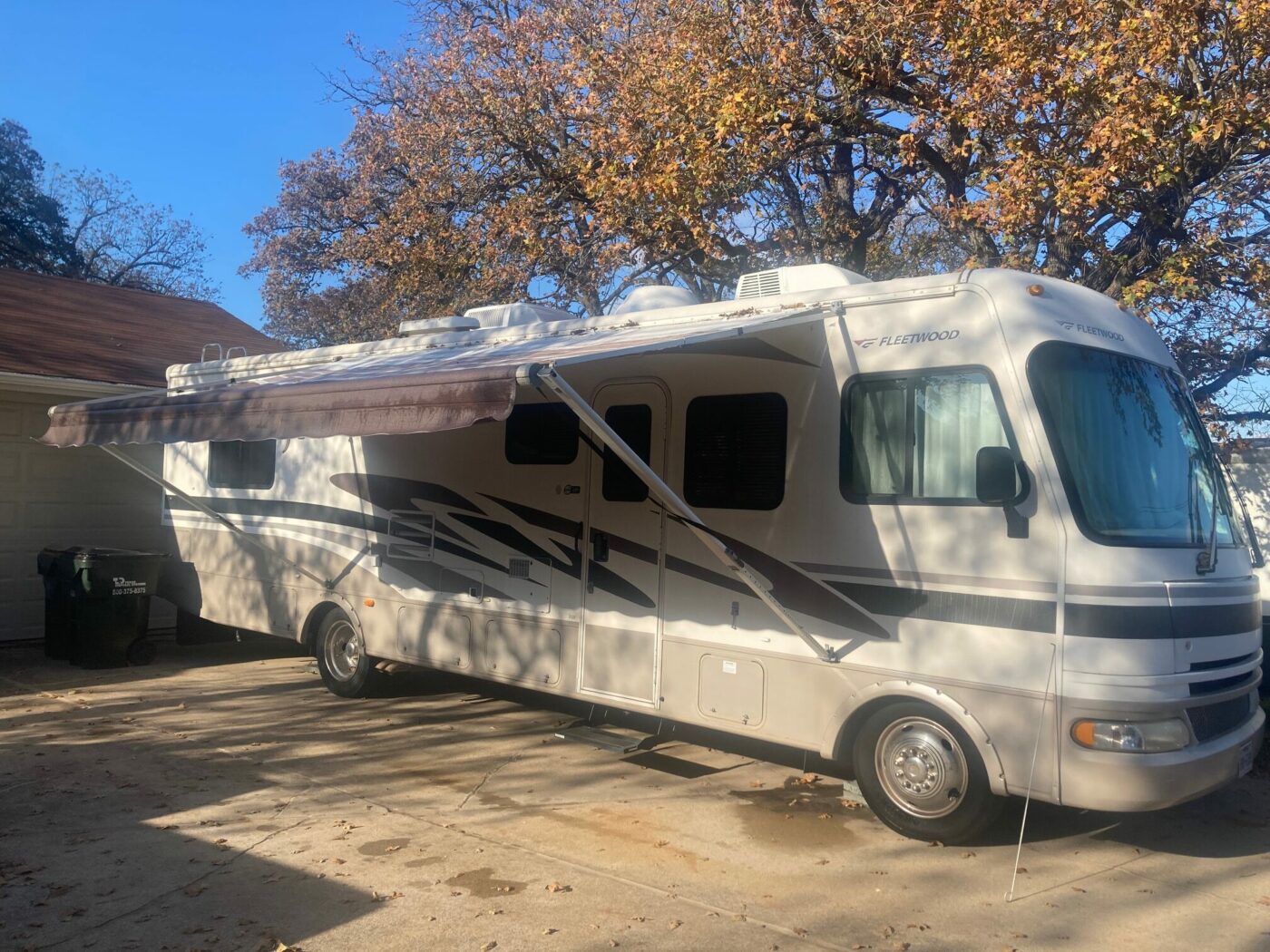 2005 Fleetwood Fiesta 32S, Living Room Slide-Out with Sofa Sleeper and Dinette, Sleeps 6, 2 ACs, 8.1L Workhorse, 54200 miles, new refrigerator, new hydraulic park brake system, new dash AC compressor, new awning, 4 point Hydraulic Levelers, 32′ 11″ long, 5.5 kW Onan Generator, In-Motion Satellite, Manual Satellite Dish, Winegard Carryout Portable Satellite Antenna, TV Antenna, 30 AMP Service. VIN 5B4LP57GX43394089
