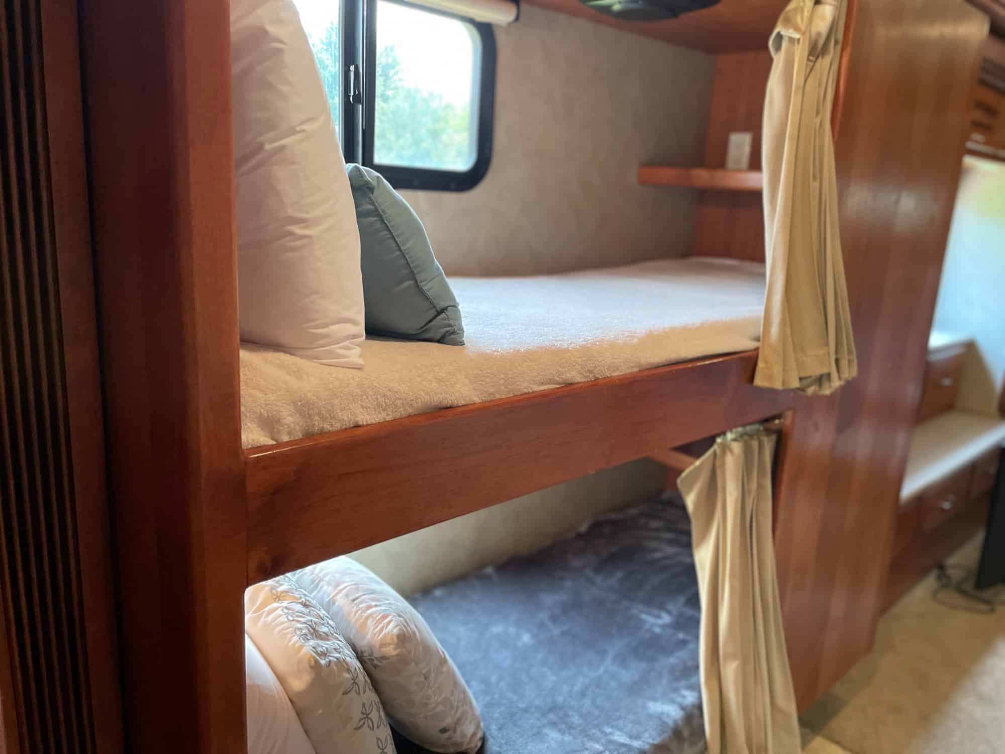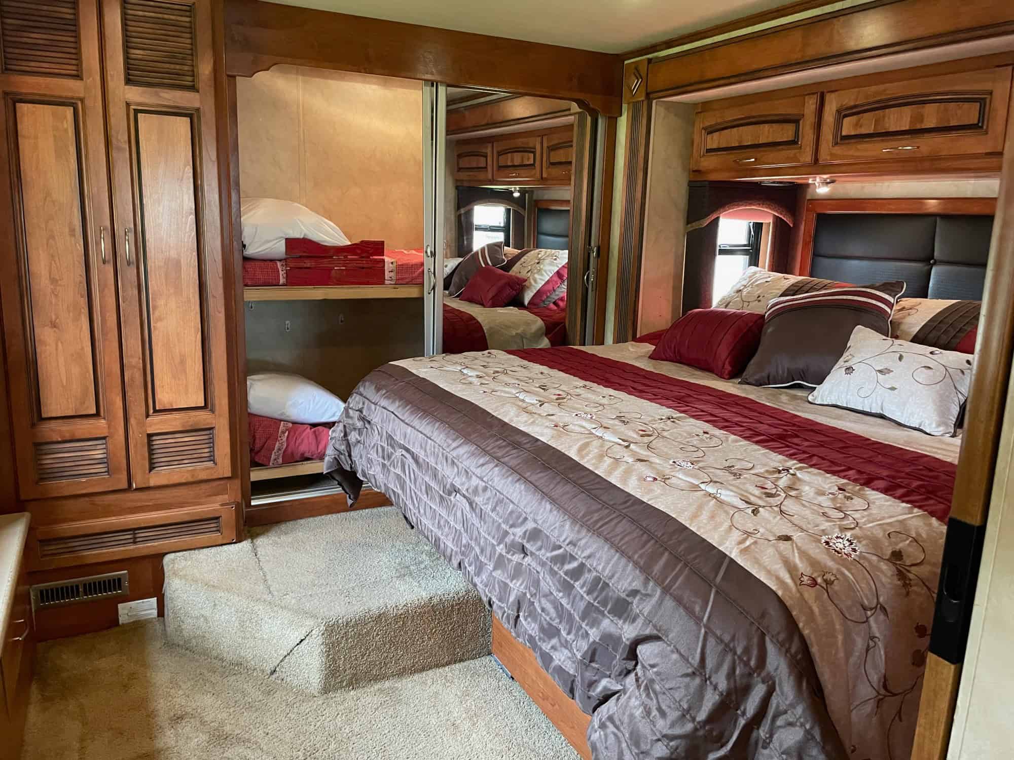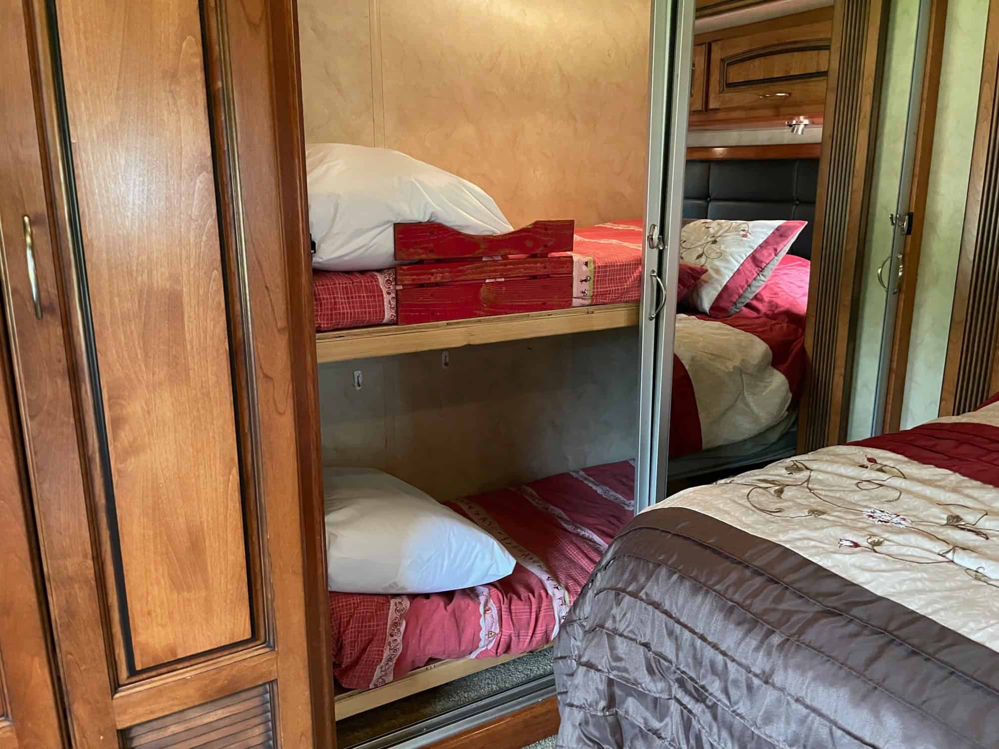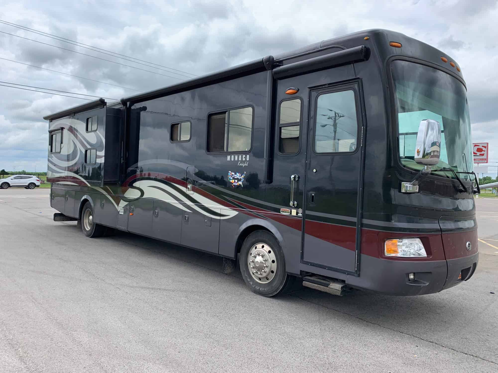 Bunks! New Tires! New House Batteries! Triple Slide Monaco Knight Motor Home, Wardrobe, King Bed/Nightstands, Bunk Beds w/Flip Down TVs Above Each Bunk Linen, Shower, Vanity, Toilet, Booth Dinette/Sofa Slide, Sofa, Flip-Up Counter, Double Kitchen Sink, 2-Burner Induction Range, Convection Microwave, Full Residential Refrigerator, 32″ LCD TV/Dresser Slide, Overhead Cabinets Throughout & Much More. 40″ TV removed and replaced with pantry (shelves are the perfect size for OXO Good Grips pop container set), but a TV could be put back if desired. The back closet has been converted to a bunk bed but could be easily removed. Washer/Dryer cabinet was converted into a closet but can be changed back to washer/dryer cabinet. Has hole drilled in counter (capped) for water filter hook-up. We removed old gas range and replaced with induction range. Cook just like you do at home (we did for 2 years)! Satellite TV system is installed. Lots of extras come with the motorhome (Garmin RV 760LMT portable GPS Navigator with friction and window mounts, WiFi Ranger, weBoost 4G-X Cell Signal Booster, spare light bulbs, spare drawer/cabinet parts, new inline water filter, 25′ culinary-rated hose), king intelligel (think purple, but better) bed Non-smoking and no pets!