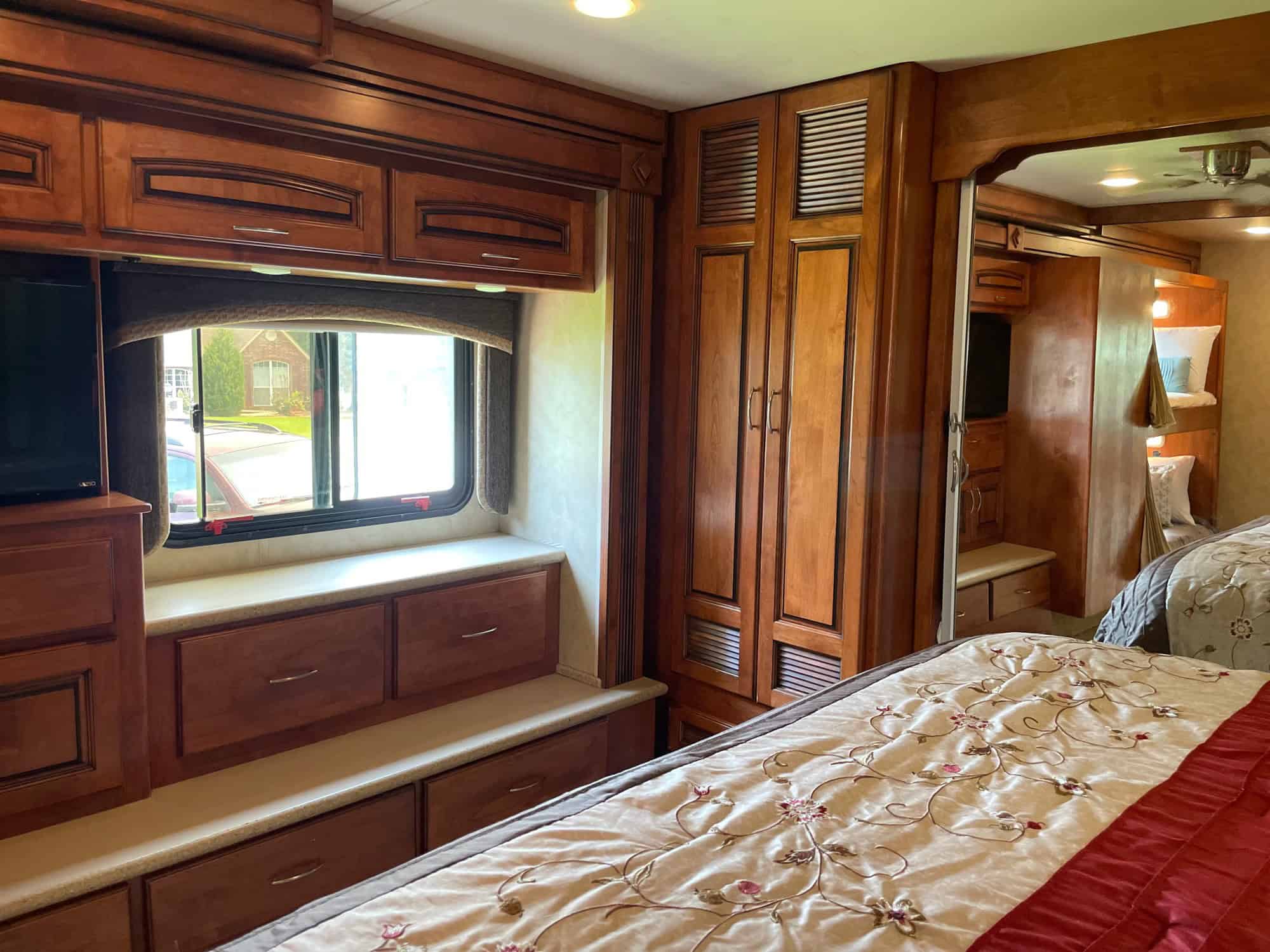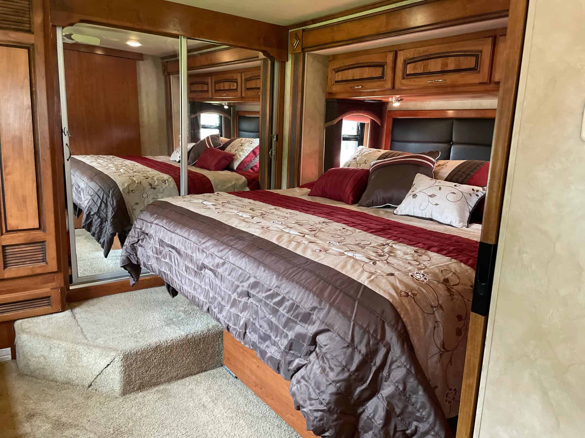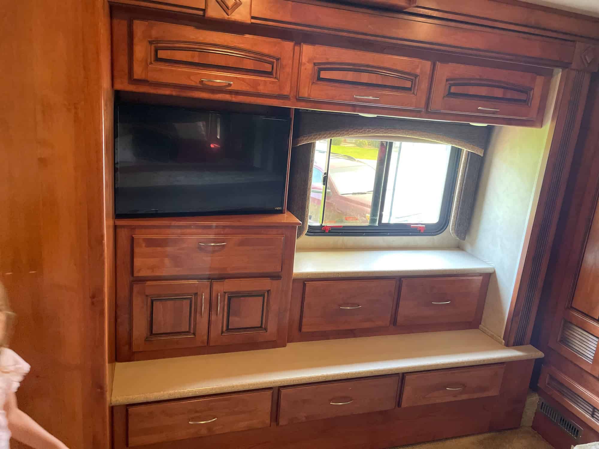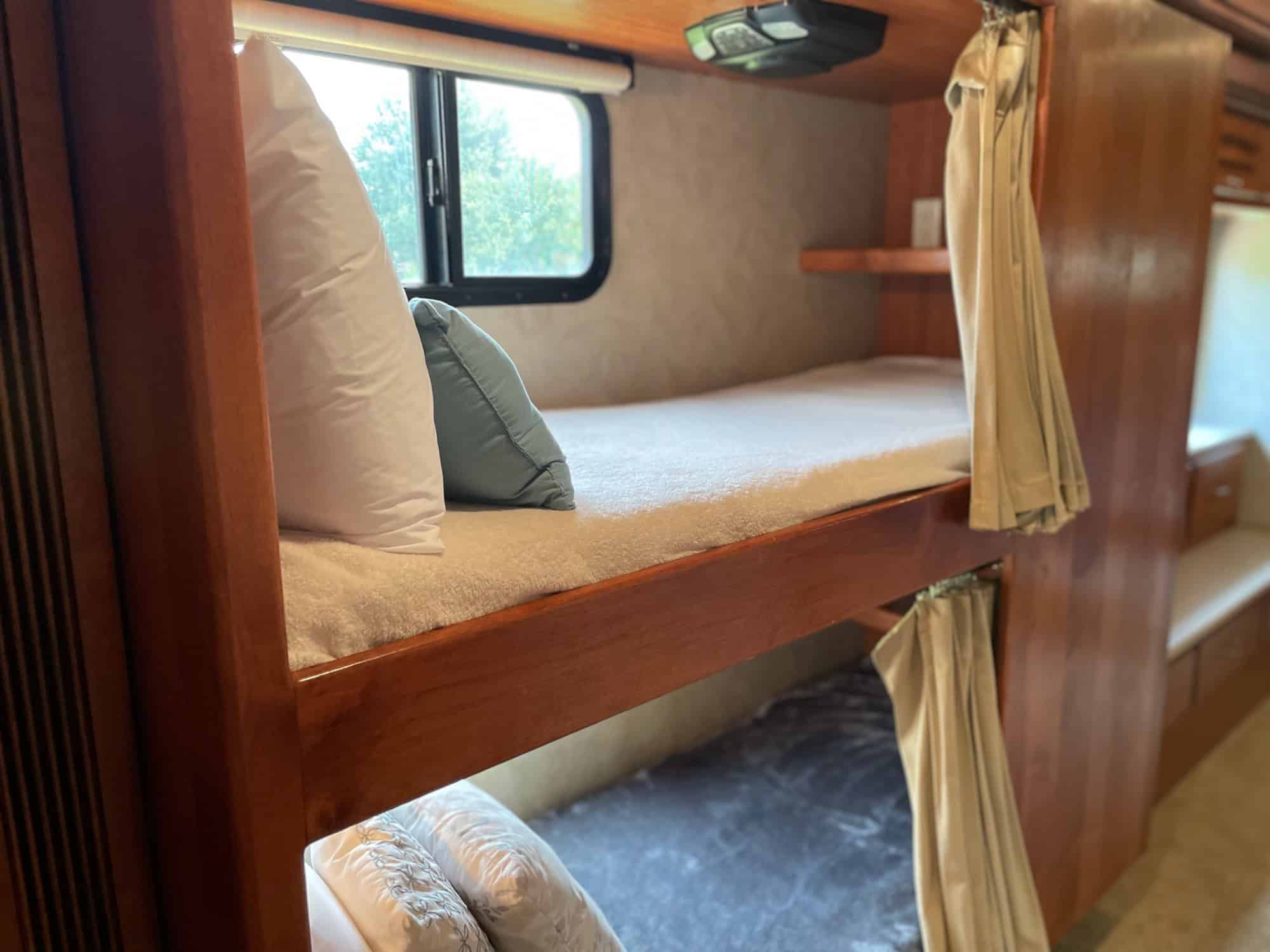 Bunks! New Tires! New House Batteries! Triple Slide Monaco Knight Motor Home, Wardrobe, King Bed/Nightstands, Bunk Beds w/Flip Down TVs Above Each Bunk Linen, Shower, Vanity, Toilet, Booth Dinette/Sofa Slide, Sofa, Flip-Up Counter, Double Kitchen Sink, 2-Burner Induction Range, Convection Microwave, Full Residential Refrigerator, 32″ LCD TV/Dresser Slide, Overhead Cabinets Throughout & Much More. 40″ TV removed and replaced with pantry (shelves are the perfect size for OXO Good Grips pop container set), but a TV could be put back if desired. The back closet has been converted to a bunk bed but could be easily removed. Washer/Dryer cabinet was converted into a closet but can be changed back to washer/dryer cabinet. Has hole drilled in counter (capped) for water filter hook-up. We removed old gas range and replaced with induction range. Cook just like you do at home (we did for 2 years)! Satellite TV system is installed. Lots of extras come with the motorhome (Garmin RV 760LMT portable GPS Navigator with friction and window mounts, WiFi Ranger, weBoost 4G-X Cell Signal Booster, spare light bulbs, spare drawer/cabinet parts, new inline water filter, 25′ culinary-rated hose), king intelligel (think purple, but better) bed Non-smoking and no pets!