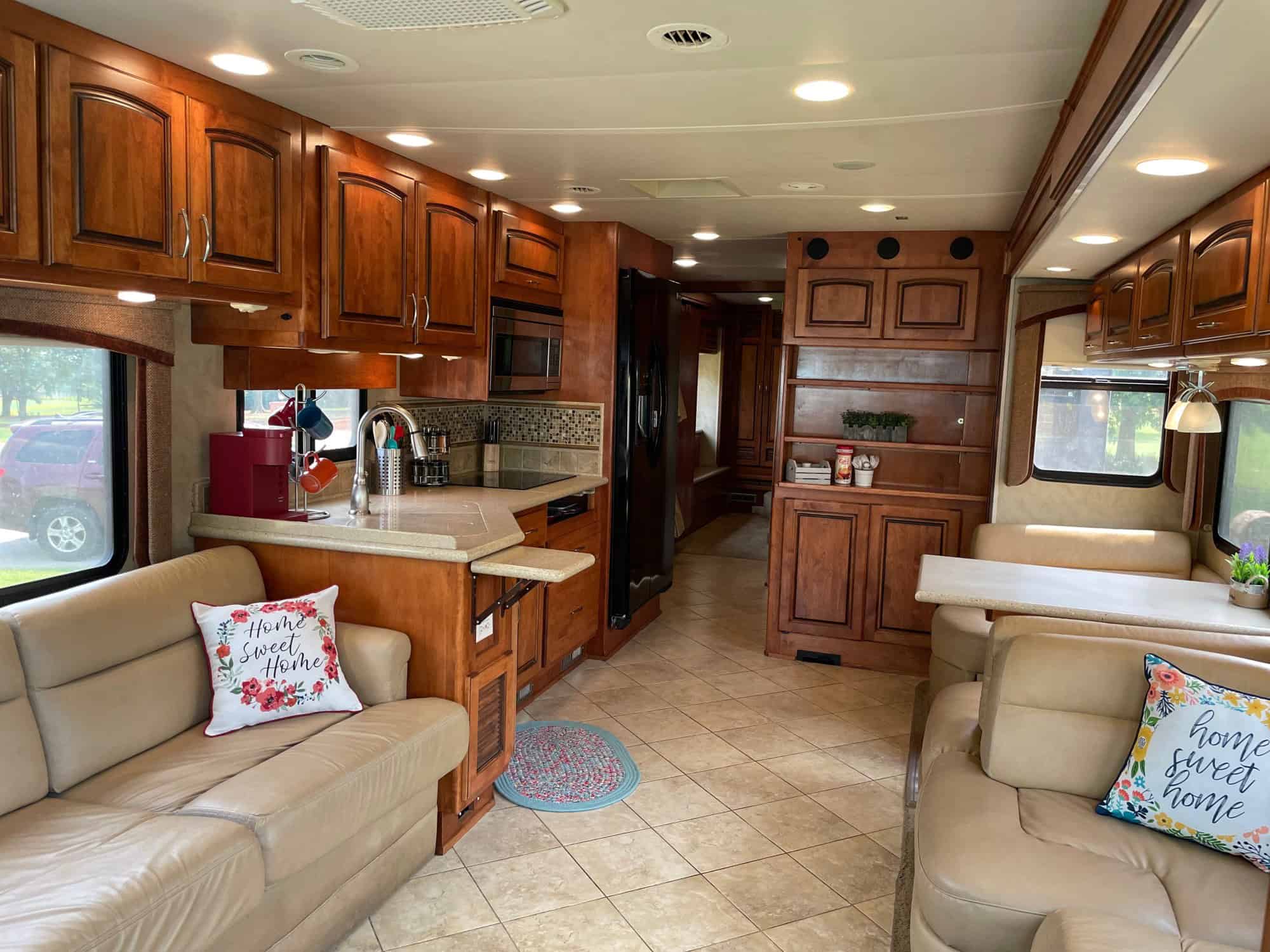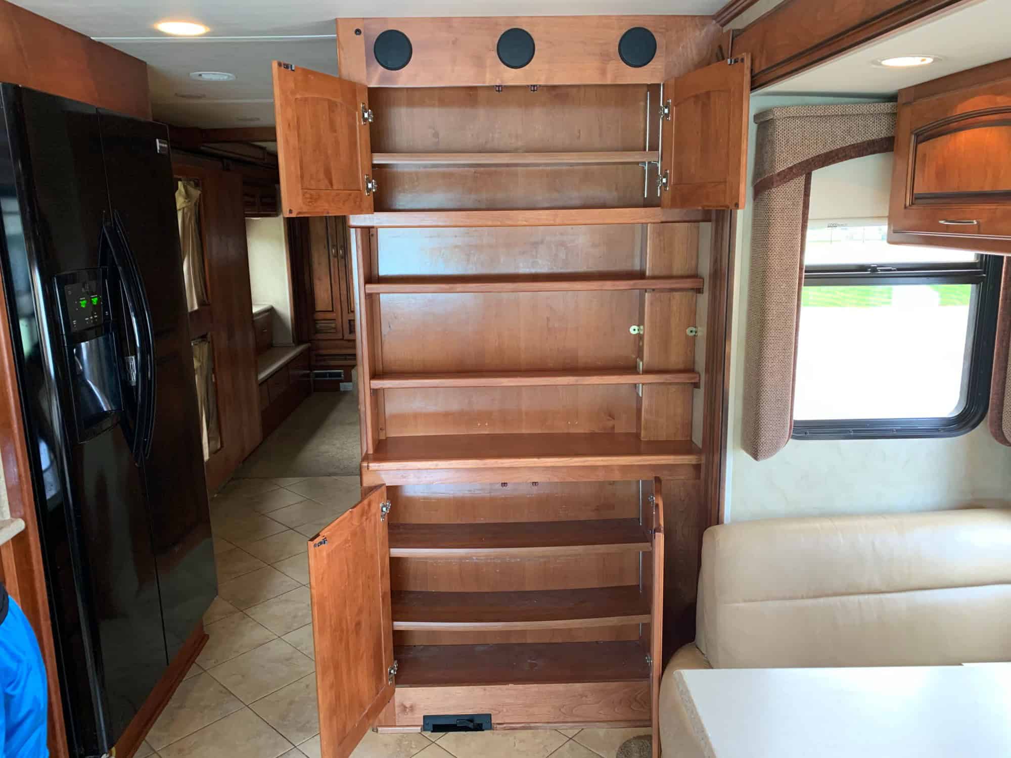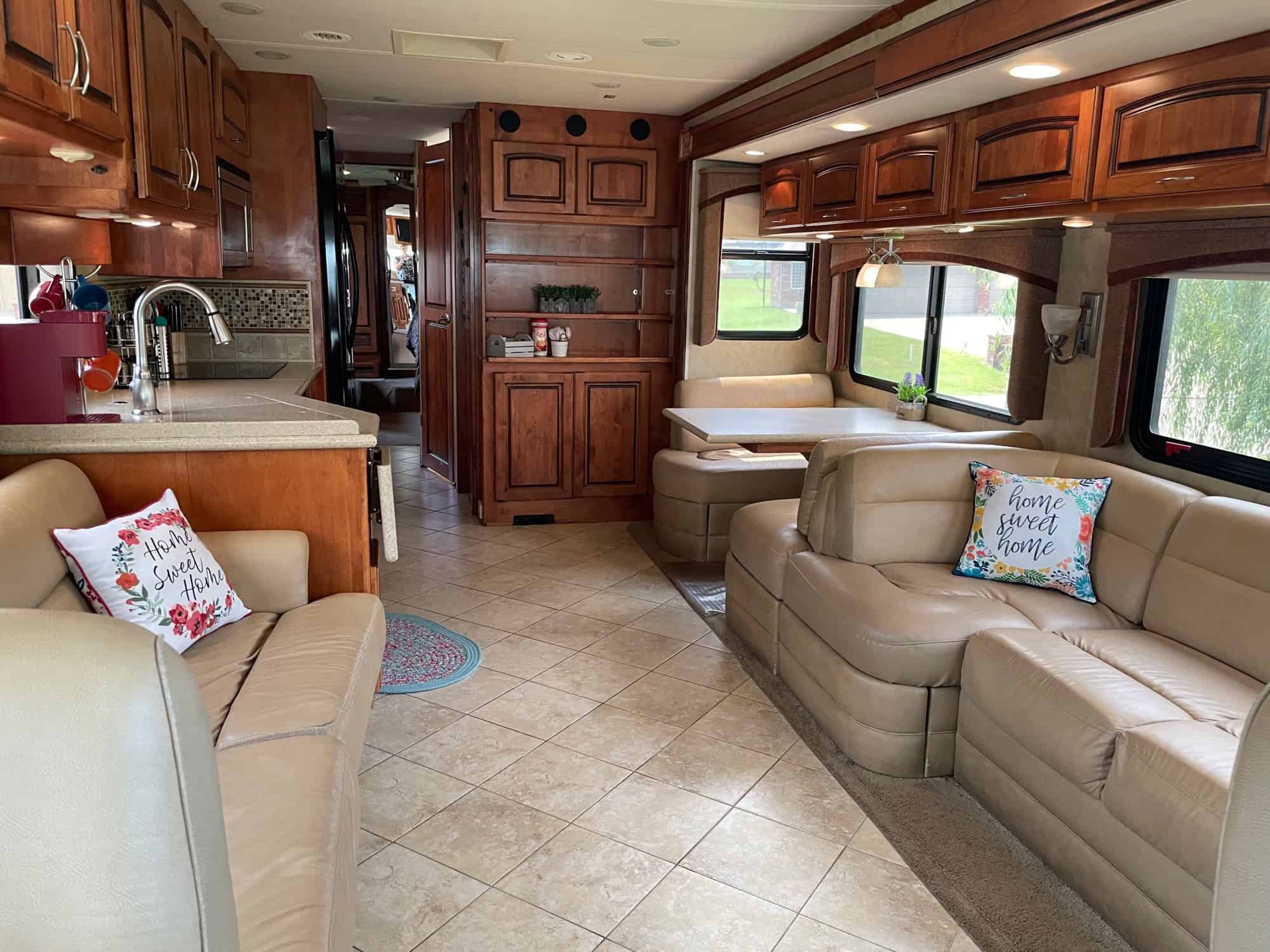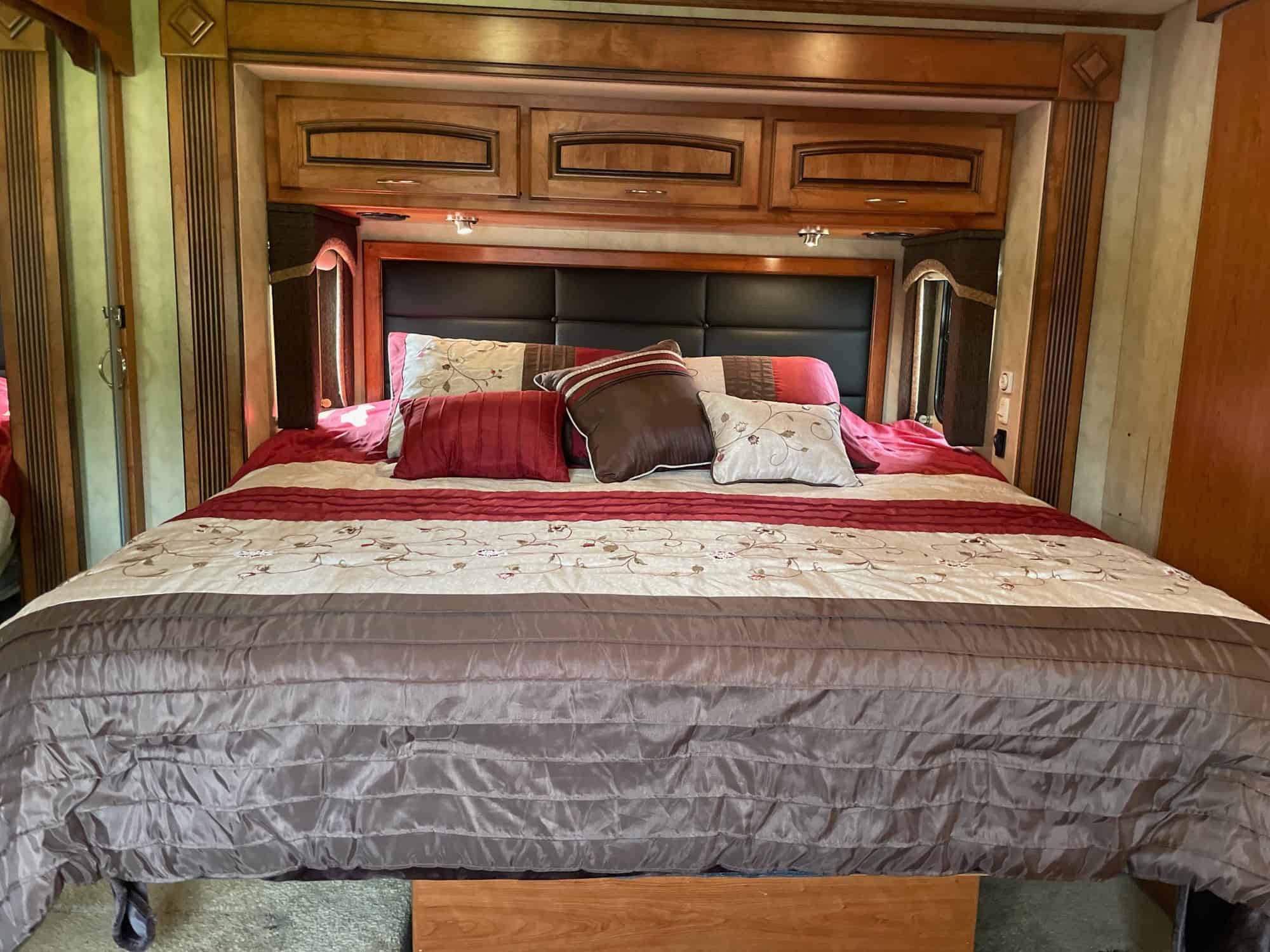 Bunks! New Tires! New House Batteries! Triple Slide Monaco Knight Motor Home, Wardrobe, King Bed/Nightstands, Bunk Beds w/Flip Down TVs Above Each Bunk Linen, Shower, Vanity, Toilet, Booth Dinette/Sofa Slide, Sofa, Flip-Up Counter, Double Kitchen Sink, 2-Burner Induction Range, Convection Microwave, Full Residential Refrigerator, 32″ LCD TV/Dresser Slide, Overhead Cabinets Throughout & Much More. 40″ TV removed and replaced with pantry (shelves are the perfect size for OXO Good Grips pop container set), but a TV could be put back if desired. The back closet has been converted to a bunk bed but could be easily removed. Washer/Dryer cabinet was converted into a closet but can be changed back to washer/dryer cabinet. Has hole drilled in counter (capped) for water filter hook-up. We removed old gas range and replaced with induction range. Cook just like you do at home (we did for 2 years)! Satellite TV system is installed. Lots of extras come with the motorhome (Garmin RV 760LMT portable GPS Navigator with friction and window mounts, WiFi Ranger, weBoost 4G-X Cell Signal Booster, spare light bulbs, spare drawer/cabinet parts, new inline water filter, 25′ culinary-rated hose), king intelligel (think purple, but better) bed Non-smoking and no pets!