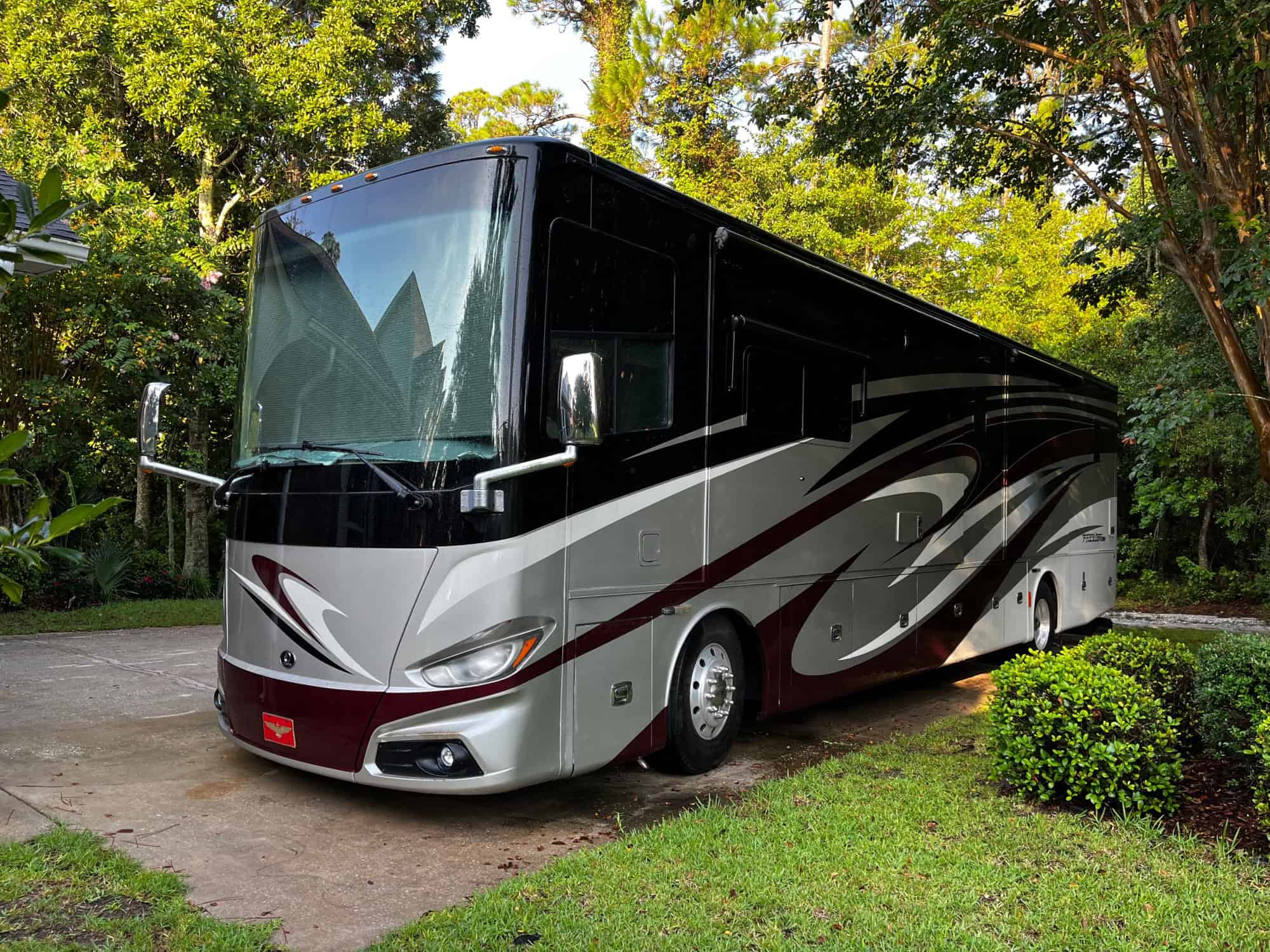 Four Slides, Amber Glazed all solid hardwood (oversized) cabinets, doors, trim & valences (upgrade option), 380hp Cummins ISL 9.0L diesel engine, 6 speed Allison transmission with 1150lbs of torque and fuel saving mode, Onan 10,000w diesel generator (slide out tray equipped) with auto gen start, large water and waste tanks with DC powered water pump, auto leveling system, NEW (June 2025)maximum size tires (295/80 22.5), stainless steel residential refrigerator freezer,4 LED TV's, ultra-leather sofa with queen size pull out air mattress, twin adjustable leather lounge seats, in coach vacuum system, dinette table with dual bench seating, full length slide out pantry, a must see interior light system, all tile flooring throughout coach, bedroom ceiling fan, in-dash GPS navigation with CD/ FM AM & satellite radio system, surround sound entertainment system ,large outside LED TV, pass through basement storage with dual basement slide-out trays (upgrade option),10,000lb hitch, three low profile 15k AC units w/ heat pumps, Sunlit Sand full body paint, all solid hardwood Upgrade cabinets, 4G Internet, IN-Motion Satellite, 2000w pure sine wave inverter, dual pane windows, dual front powered shades (blackout & solar),stacked washer/dryer, propane/electric hot water system, 3 way cameras, Memory Foam King bed, auto leveling system, keyless remote entry with two fobs and coded door entry pad, adjustable leather power front seats, adjustable steering column, huge Shower, High polished aluminum wheels, dual side (100 gal) fuel fill, slide out house battery tray, heated power mirrors, heated tanks, full window awnings and large powered patio awning, electric 50amp power cord reel & water reel, one-piece molded fiberglass roof and much more!!