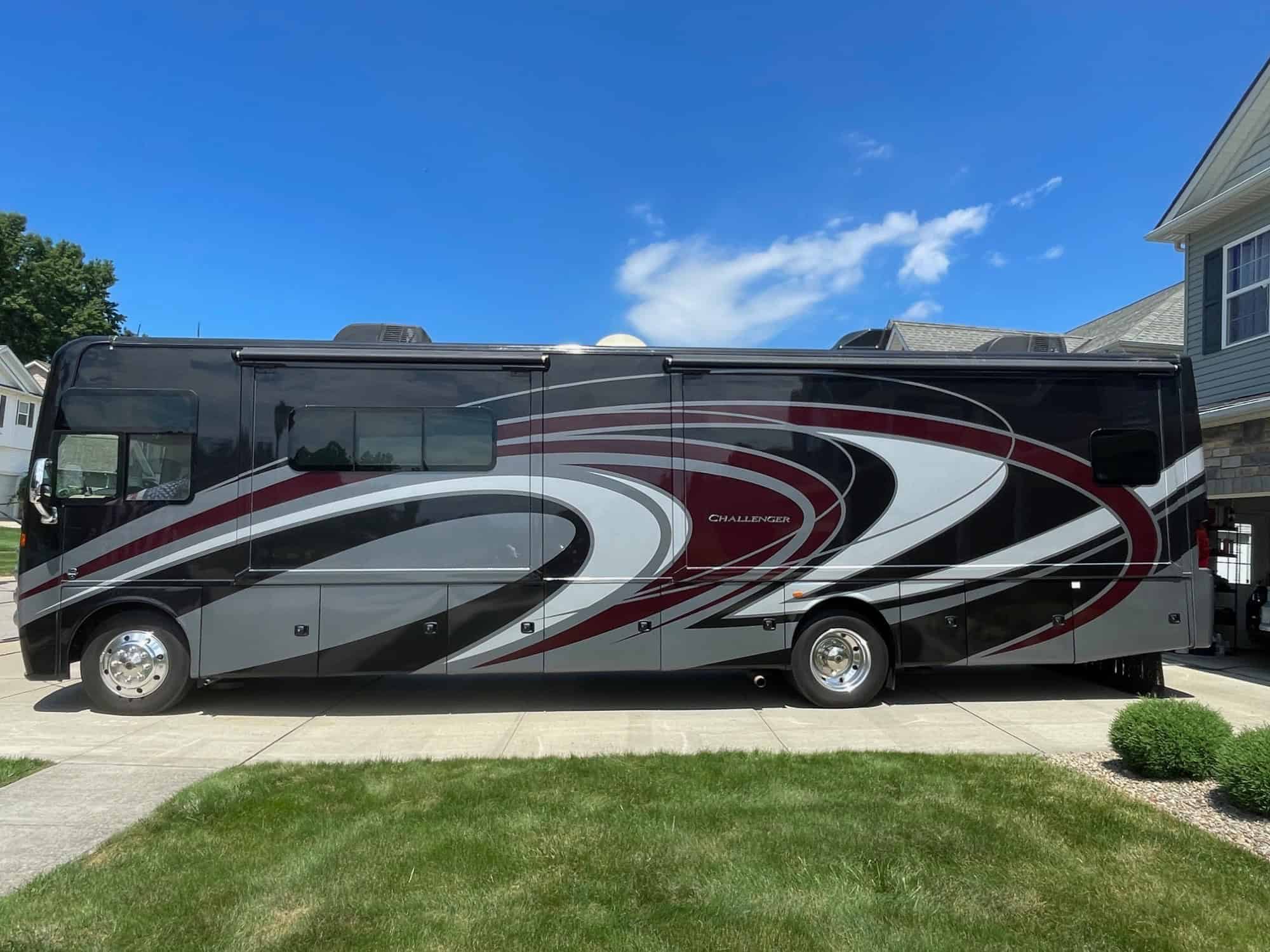 3 slides; Full wall slide -kitchen side has been upgraded with new Vroom system. 1 large outside power awning; Automatic leveling jacks with jack pads; full size fridge; convection / microwave oven; sleeps up to 8; king size bed; recliner and jack knife sofa bed, table bed and overhead bed; 1 lg bathroom with shower & double sinks; New house batteries in 2023; new chassis battery in 2024; New smart tv’s in bedroom & living room; TV in outside compartment; Tire monitoring system included with digital screen; Updated video screen to see all cameras at once; side cameras; seat covers on front captains chairs — original vinyl upholstery on chairs is starting to peel (common issue); living room furniture has been replaced with new recliner and sofa bed; Roadmaster Steering stabilizer; stored inside for winter never seen snow; more pictures upon request; NE Ohio