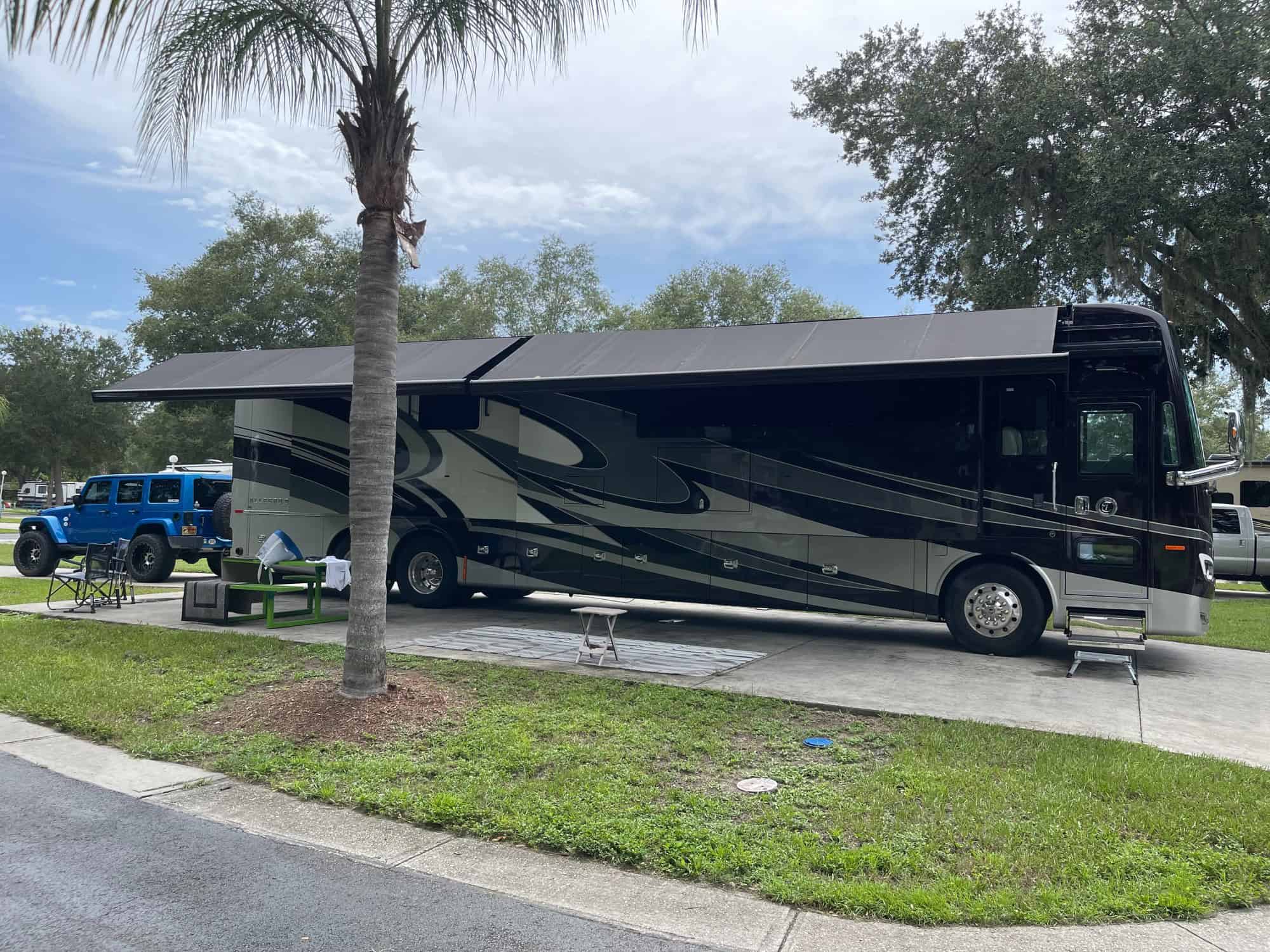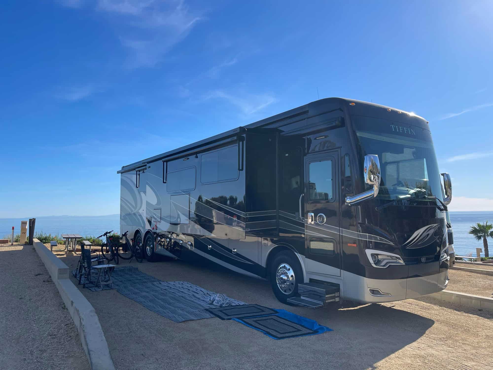 Among the many, some of the top upgrades include: Full Lithium chassis battery bank (810ah Battle Born), six-panel solar system (1050 watts), Aqua Hot 450D hydronic heating system, Zoom slide-out system, Winegard Trav’ler and Playmate satellite dish system, Mobileye collision avoidance, TPMS, and Lazy Boy ultra-leather adjustable theater seating with a JBL surround sound system.