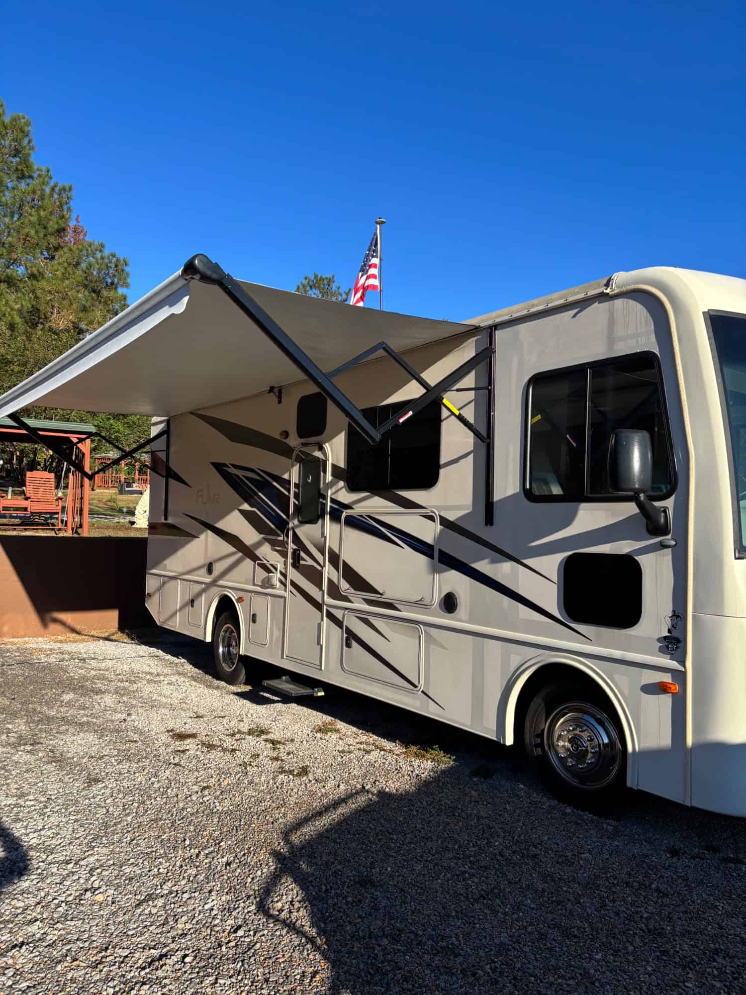 Cabinets, Cooktop Cover, Counter Backsplash, Dinette, Hood Fan, Kitchen Sink, Microwave, Oven, Pantry, Refrigerator/freezer, Stove, Bluetooth/aux., CD Player, Digital TV Antenna, Entertainment Center, Exterior TV Source, Interior Lighting, Satellite Radio, Stereo System, Surround Sound System, Air Conditioning (2), Bathroom Sink, Bed – King, Bed: Drop Down Bed (Full/queen), Black Water Flush System, Ceiling Vents, Control Center, Dinette Sleeper, Medicine Cabinet, Recliners,Shower, Sink, Skylight, Slide-out, Storage, porcelain Toilet, USB Charging Port, Water Filtration System, Water Heater, Windows- Day Night Shades, 110 Lighting, 110 Outlets, Backup Monitor, Batteries – Engine, Battery Charger, Battery Charger – Solar, Braking System, City Water Hook Up, Generator, Hitch, Inverter (1000), Power Cord, Power Seats, Self Contained, Water Filter, AC Electrical Power, Batteries – House, Automatic Steps, Awning – Slide-out,Entry Assist Grab Handle, Exterior 110 Outlet, Exterior Shower, Exterior Speakers, Exterior Storage (Pass Through), Exterior TV, Porch Light, Propane Tanks, Roof Access Ladder, automatic Leveling Jacks, Brakes (Hydraulic), Co2 Detector, Emergency Exit, LPG Leak Detector, Smoke Detector, Spare Tire Kit, Ford Chassis, Vinyl Floor, Automatic Transmission, 1-Axle, Waste capacity: 37 gals, Gray water capacity: 37 gals, Width: 8′ 4″, Height: 12′ 4”
