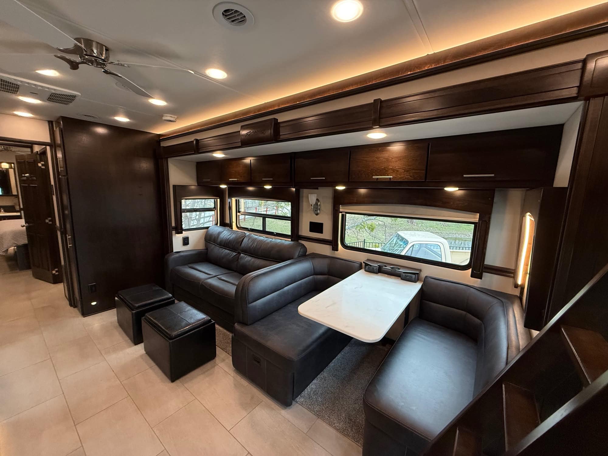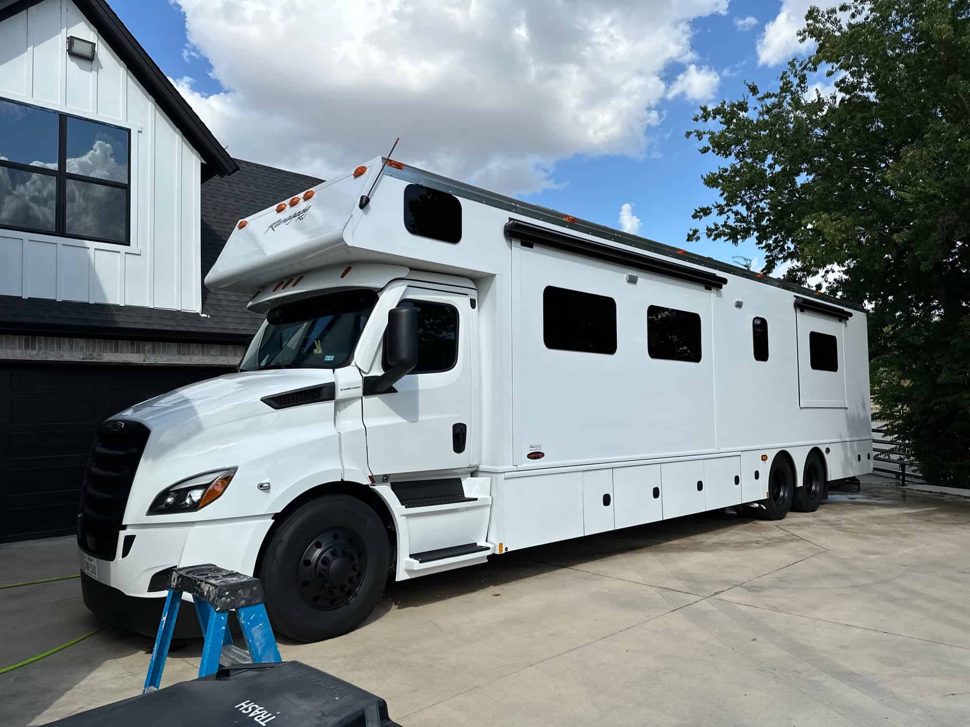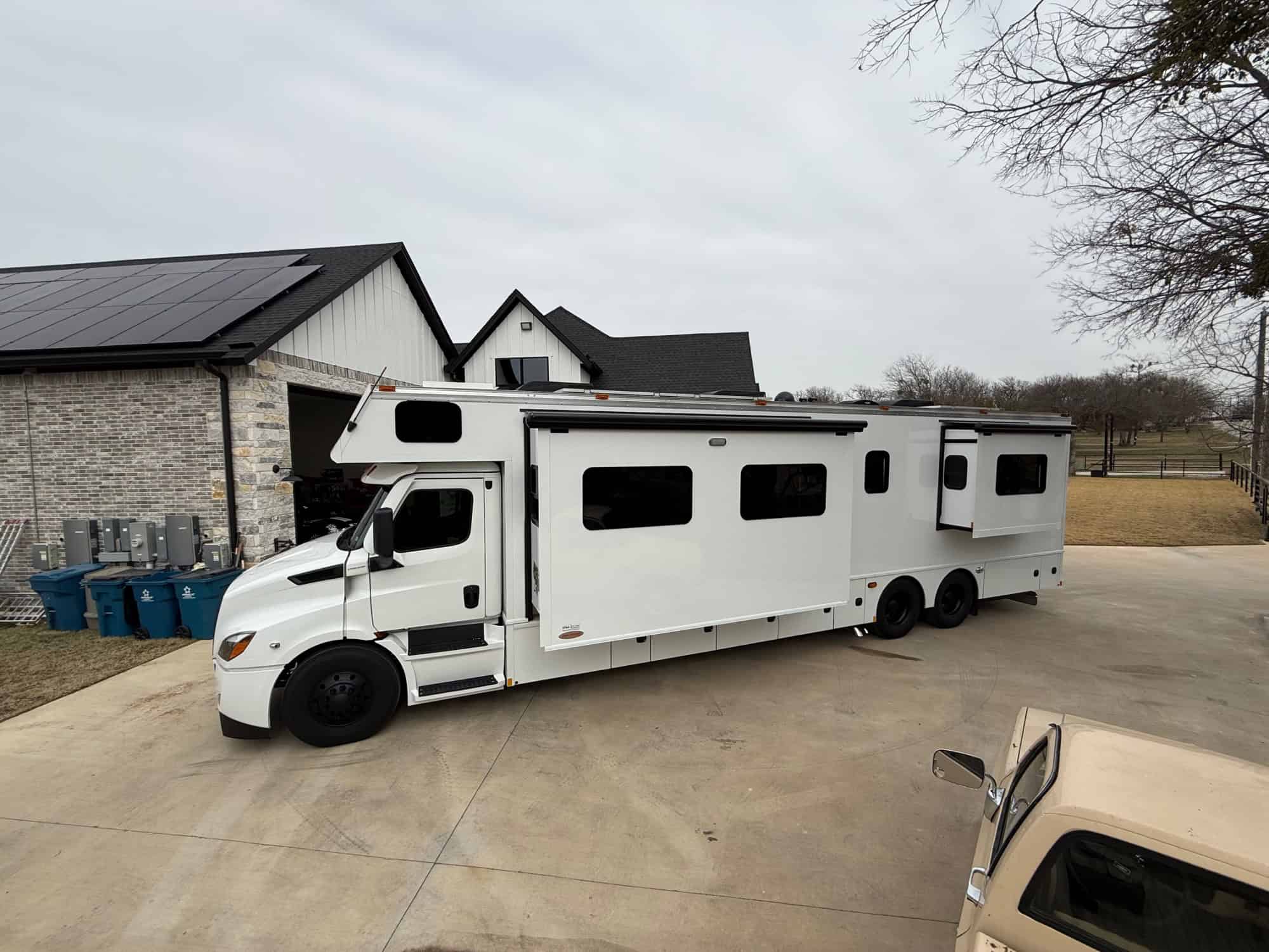 Loaded Bunk model with 2 full baths, washer and dryer, sleeps 10. 150 gallon freshwater 75/75 grey black. Dealer installed options: blackout kit, Starlink WiFi , EZ starts on heat pumps, CB Radio. This is the last year model of the spray foam insulation. Heats and cools in extreme conditions. Always kept inside when not in use. DD13 525 hp with Allison 16,000 miles on coach and 125 hrs on the 12.5kw generator with 50 amp buddy plug for another RV or trailer.120 gallon fuel tank. 525watts of solar, 3 big lithium house batteries and (2) 3,000 watt victron inverters, heated floors, aqua hot 450 (electric/ diesel fired). I wasn’t satisfied with the factory horn so it might be mistaken for a locomotive. Ceramic window tint on cab.